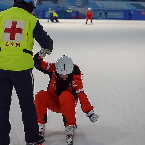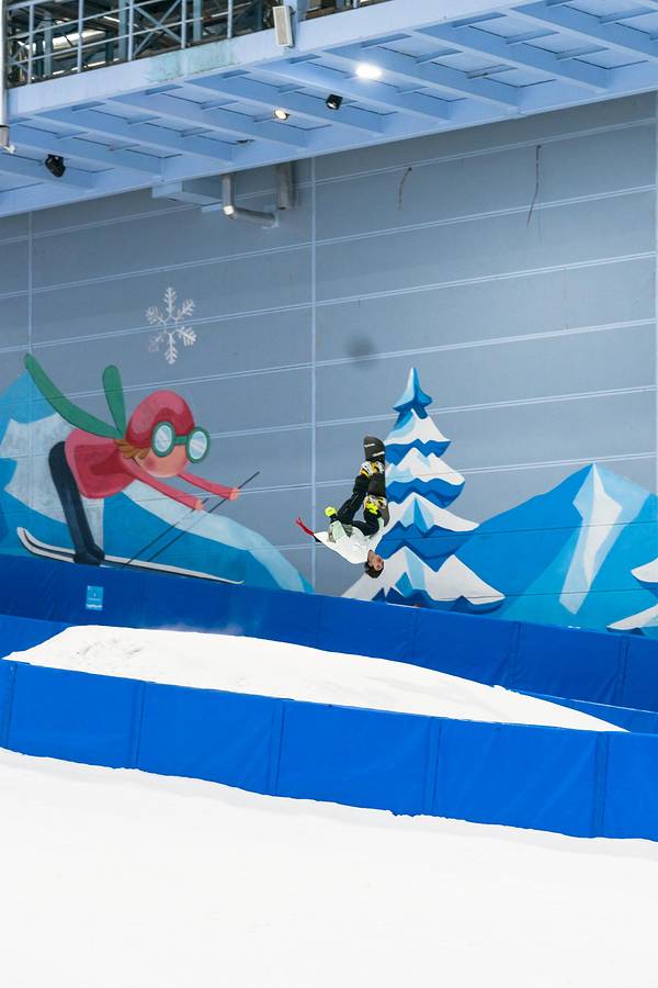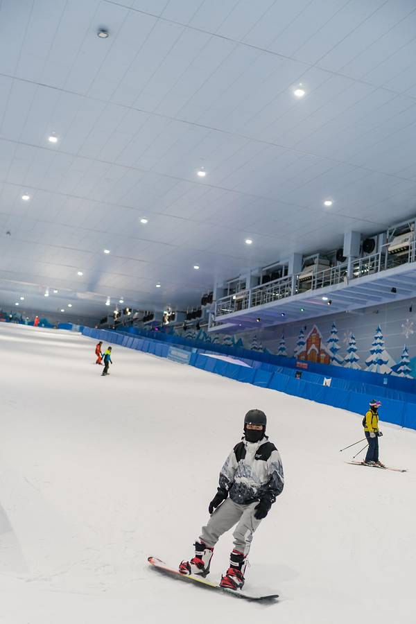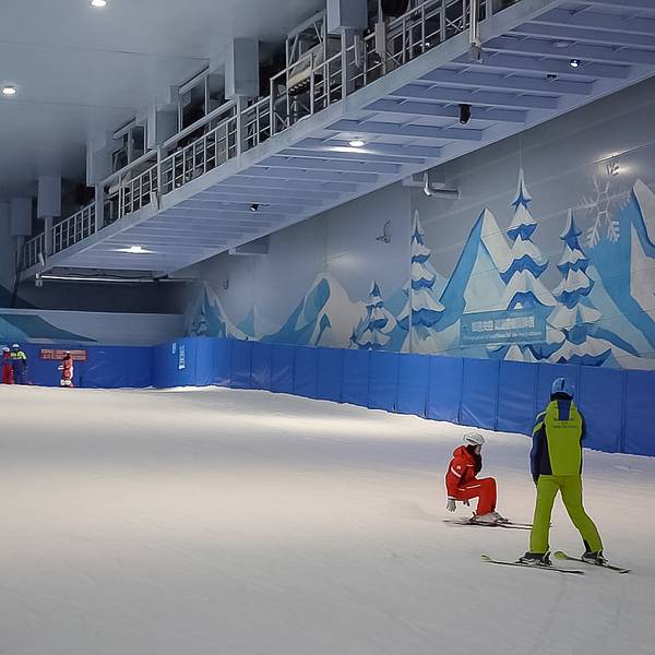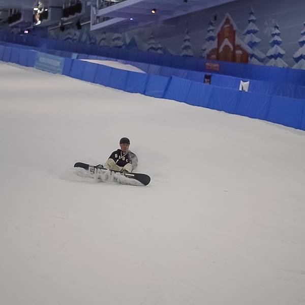 我还是有一点基础的,就上初级道,放飞自我吧。初级滑道就是菜鸟的试金石。有的人稳稳地匀速飞驰而下,有的人边尖叫着边摇晃着滑过身边,或者直接摔倒在地。对于滑雪这样需要反复练习的技巧性运动,摔跤是最正常不过的事情。室内雪场雪比较紧实,摔跤比自然雪还是更痛。大家都是菜鸟,所以不止自己要注意避免摔倒,还要防止别人摔倒失控撞到自己。相比初级赛道的拥挤和尖叫声,中级赛道上则是一片和谐。有一定基础的滑雪达人,一般会选择单板,因为平衡已经不是问题,更多的是挑战技巧性的动作。