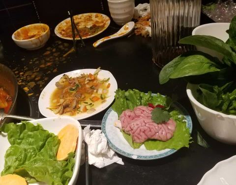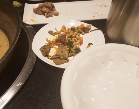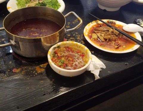 大锅很好吃啊,菜也不少,猪脑点了没敢吃啊。吃完才拍的,有点狼藉啊。