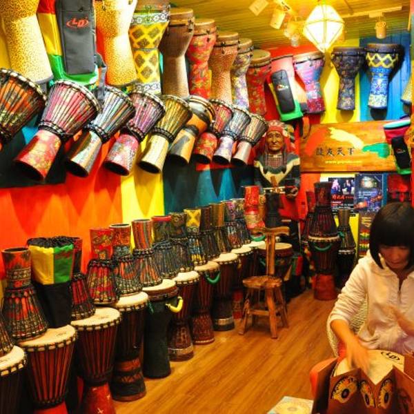 - 路边各式小店很吸引我们,各种小鼓,还有披肩长裙。在各种播放软件里都可以搜素到
