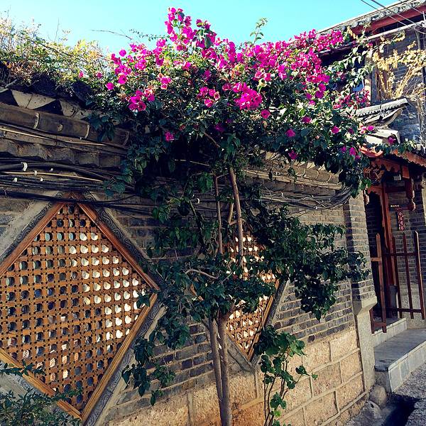 到达丽江是下午一点左右。出了机场就被一个当地大妈拦住让我们上他们的车(就是传说中的黑车),到古城70,说是比打车便宜多了。没有什么国内经验的我们也就毫不考虑地坐了。开车的是大妈的老公,听这对夫妻说他们只是想出来多挣点钱给女儿赚学费,要是有生意尽量介绍给他们。(后来听说有人做黑车被开到很偏的地方载了几千的,想想才后怕,看样子我们的运气还不错。还是建议大家不要找黑车了。) 老夫妻把我们放在了古城门口,等着老板来接我们去客栈。丽江的客栈很多都很隐蔽,自己拖着行李箱很难找到。这是我们住下的芝麻开花客栈,在比较安静的古城深处。客栈虽小,但是装饰得很有情趣,是我喜欢的调调。