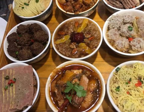 酸奶凉粉蔬菜沙拉你又何必等而这当中最隆重的是沈派九碗三行子,由服务员郑重其事地上菜并声情并茂地诗朗诵去介绍了一番,完了各位客官不叫好鼓掌那是说不过去了。每一样都可以挖一点尝尝,而我也是从这里开始认识到原来羊肉跟牛肉真的可以傻傻分不清楚的。【蒸丸子、卤牛肉、糯米等等,结果我们都没有吃完】【亮剑吧!winter is coming~!(这个肉串大大大,这个羊肉辣辣辣)】