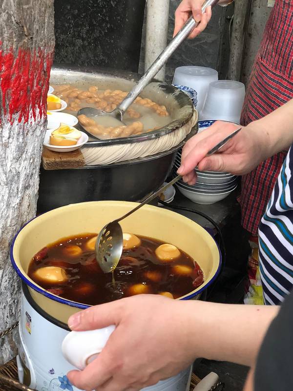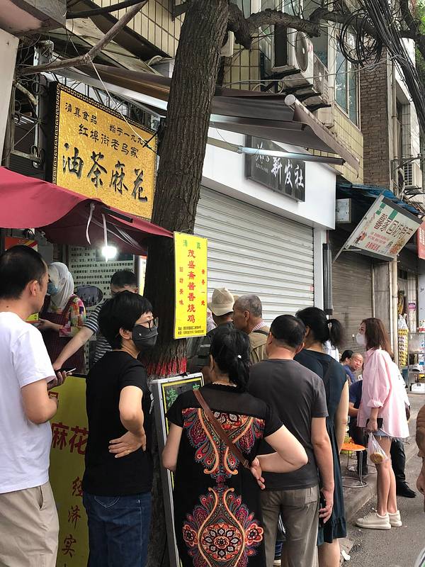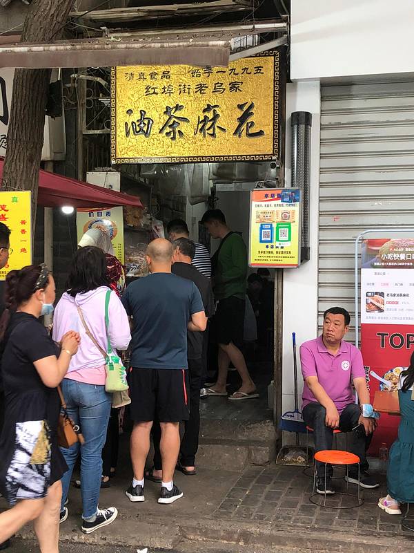 早上一早起床,继续去会会各路美食,第一站老乌家油茶麻花:8点钟油茶麻花就已经拍老长的队了,老板娘坚持跟每一位顾客介绍吃法,要延碗边吃,不要搅的太过,认真负责的态度也是他家这么火爆的原因之一吧。我们两个姑娘要了一碗大份的,包含两根麻花一个溏心蛋,感觉吃饱了,第一次吃这东西黏糊糊甜丝丝咸溜溜,实在不好形容,唯一可以说的是现在在写游记的我又想吃了。 ✧*。٩(ˊᗜˋ*)و✧*。 (⃔* 'ㅅ'*)⃕