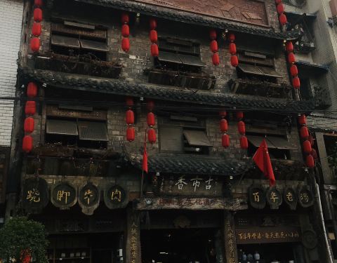 跷脚牛肉是乐山的名小吃,而且还上了舌尖上的中国,要吃正宗的翘脚牛肉还是得到苏稽去吃。古市香跷脚牛肉已经是几十年的老店子了,老板传了好几代人,最开始的时候古市香的店面环境比较破旧,后来翻新了一下,改成了两层楼,装修的古色古香的,环境挺不错的。而且它家的名气比较大,生意也是相当的不错。古市香的菜品还是挺多的,建议尝试一下它家的嫩牛肉和鲜毛肚,嫩牛肉烫出来特别的好吃,口感细嫩,在配上它家的特制辣椒面,味道真的不摆了,两个字,好吃。温馨提示:一定一定要喝一碗它家的汤底,味道绝对的鲜美,而且还是免费的。。