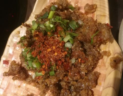 说到乐山的地方美食,肯定是跷脚牛肉莫属。本来乐山大佛出来打算去另一家,司机强烈推荐我们来这里,虽然路程绕远了,不过真的好好吃。 店面很大,几层楼高外观非常霸气,和朋友直接点了他们家的几个招牌菜,又打包外卖的跷脚牛肉。 「跷脚牛肉混烫」乐山发源地,跷脚牛肉是在滚烫的水里将新鲜牛肉直接下锅烫熟,牛肉本身口感鲜嫩,蘸一口辣碟,鲜上加鲜。 「油捞牛肝」第一次吃,不仅口味很美味,菜肴的做法也很独特,直接滚油上桌,当着客人的面把牛肝烫熟,色香味俱全,当场的制作更带来一种独特的融入体验。 「甜皮鸭」类似酱鸭,乐山本地的又一个老字号,表面很甜,吃口比较粘,表皮比较脆。 「血旺」血块配麻辣真的是绝配,麻辣把血的鲜味全部吊了出来。 「三鲜冰粉」冰粉绝对是用来解辣的。 2个人也就点了4个菜,完全吃饱,性价比很高,最后连吃带打包,有机会一定要再来吃。