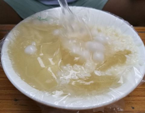 不同于红糖冰粉,这家更像是醪糟冰粉小圆子,冰冰甜甜的略带酒精发酵的清冽,是一种不同于天府传统的美味,原创三鲜,有点点题了。