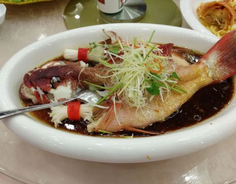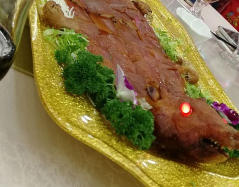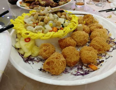 亲戚在这里摆婚宴宴席宴请亲朋好友来吃饭,专门从广州过来三水。酒家位于三水森林公园里面,门面有点残旧。因为在森林公园内,因此周边的空气环境都是不错的。 餐宴在三楼大厅摆设,这里可以容纳大概48围左右。空间挺大的,也比较明亮。就是空调开得有点大…… 婚宴因为请了电台主持人,所以全晚的气氛都搞得很好,又唱歌,又跳舞,又表演魔术,大家都很开心。 菜色餐单也是别有用心的,鲍参翅肚全部齐全,餐前每人一个炖盅,竹笙羊肚菌鸡炖鱼翅,材料十足,清甜。 金猪全体,乳猪皮已经不脆了,稍微逊色。 大花龙伊面,龙虾实肉鲜甜。 莲藕片大连鲍,新鲜的鲍鱼,爽口弹牙。 鹅掌扣辽参,鹅掌焖得很软,很入味,但海参就不够入味。 鹅肝球拼带子丁,吃不出有鹅肝的味道。 清蒸野山红东星,第一次吃这种鱼,蒸得有点过火了,不够嫩滑,有点浪费了。 其它的菜色炒饭,炒粉丝等等味道都算不错的。当然这是一分钱一分货。大家吃得都很满意。