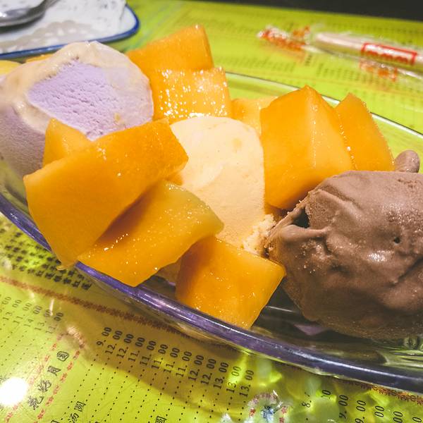 不夸张地说,这里的冰点,与我最近刚在曼谷吃到的After You、Swensens相比也毫不逊色啊魂淡!芒果雪糕,这个就不太推荐了,冰淇淋球有点腻口,太甜了。最后,无法压抑的自己,自己又单点了份莲子刨冰!