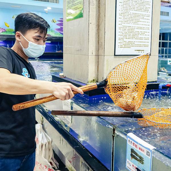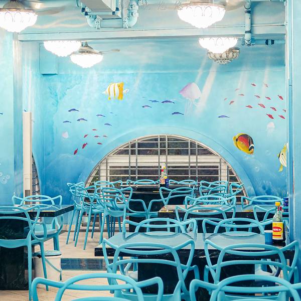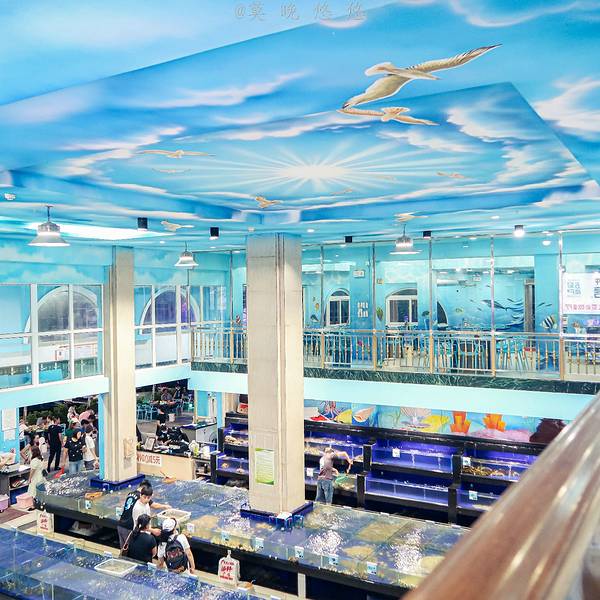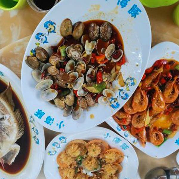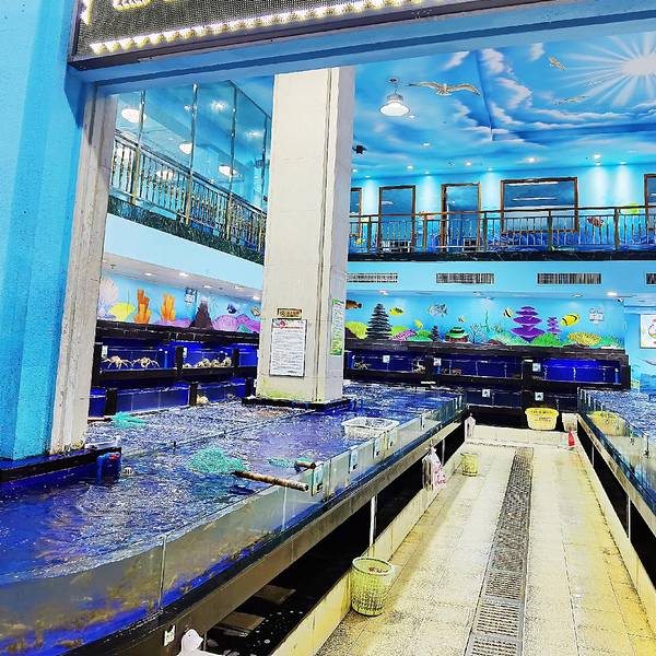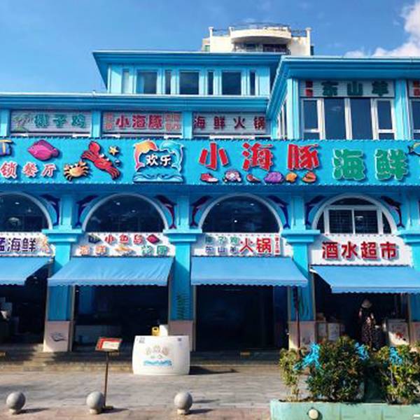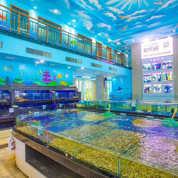 小海豚的装修也很有特色,蓝色主调,有种置身在大海里的感觉。这里的广场中间是独立的海鲜池,这里的海鲜都是当地渔民直供的,特别鲜活,去了就能挑选海鲜然后拿到店里去加工,上称时还会帮忙检查海鲜是否是活的...