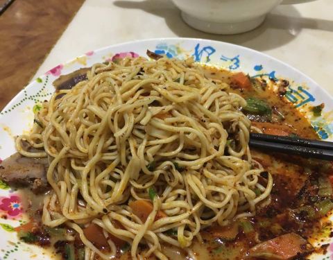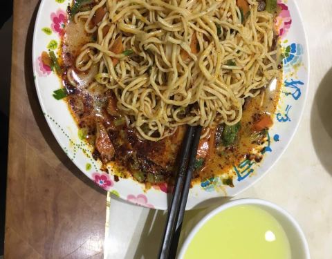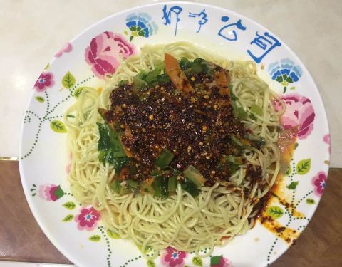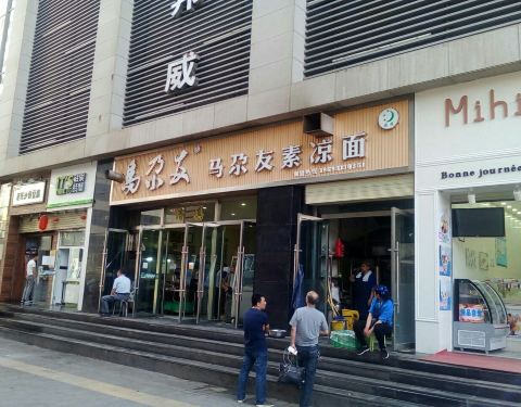 当地非常知名的一家主要经营凉拌面的连锁餐饮店,而且是素拌面,但是荤菜、烧烤肉类也有售卖,预制好的凉面配上调料和素浇头拌匀食用。
