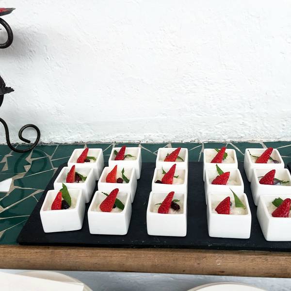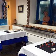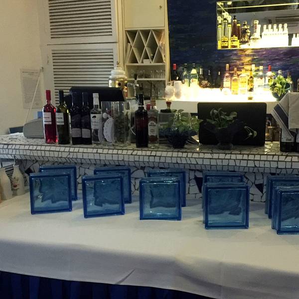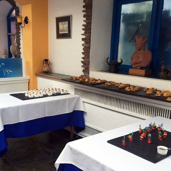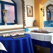 很安静的一家小店,位于使馆区内部,里面布置是希腊风格的,餐厅整体装饰都是蓝白色。灯光很到位,适合和两三个好友聚会,或者和爱人用餐。单点菜品的价格很贵,所以建议去吃中午的自助,你想吃的东西基本都能吃到。自助部分一如既往的很精致,海鲜烧烤拼盘,有虾、鱼、鱿鱼圈。都非常的新鲜,尤其是虾,相当新鲜好吃。推荐烤羊腿, 一点都不膻, 保留了羊肉的新鲜清香。 三文鱼也不错, 肉质细腻。冷盘包括各种蔬菜沙拉,茄子卷、腌制的蘑菇拌菜、土豆培根沙拉。有个土豆泥很绵软,是热的,应该算配菜吧。汤是两种:龙虾汤、蔬菜汤,前者不错,但不要期待里面有龙虾喔,蔬菜汤看着比较寡淡,没尝试。甜品推荐提拉米苏,布丁不细腻。热饮有咖啡茶两个选择,咖啡配甜品不错。总的来说价格很实惠。服务员素质较高。