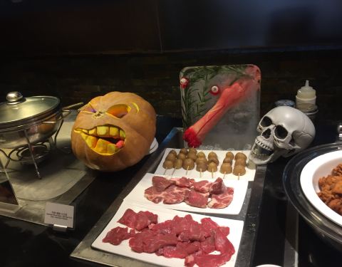 正赶上万圣节,那就应个景儿,来一层吃个万圣节自助餐。一进门口就吓了一跳,站着一个鬼怪还会动,鬼哭狼嚎的气氛衬托的不错。吃的食物都很新鲜,骷髅,蜘蛛、血淋淋的。餐厅服务员都很勤快,态度和蔼。餐厅经理...