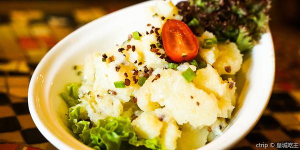 必吃榜推荐餐厅,开在使馆区核心,日坛公园南侧,没几把刷子是很难开下去的。 总体来讲他家应该是德式的。西餐里我还是比较接受德餐,觉得德国人比较实用主义,主菜全是大猪肘子,大香肠什么的,解馋,香。 很可...必吃榜推荐餐厅,开在使馆区核心,日坛公园南侧,没几把刷子是很难开下去的。 总体来讲他家应该是德式的。西餐里我还是比较接受德餐,觉得德国人比较实用主义,主菜全是大猪肘子,大香肠什么的,解馋,香。 很可惜一个大猪肘子太大,我又处在减肥期,没敢尝试这些,估计应该不错。 思来想去,最后点了厨师沙拉,真的很不错,内容特别丰富,营养也均衡。什么维生素,膳食纤维,蛋白质,动物蛋白都有,拌在一起口味不违和。最妙的是油醋汁,不像寻常的,就是油和醋。貌似加了糖,又炒过,类似中餐的做法。总之很柔和,轻轻地进入沙拉里,吃到嘴里特别舒服。 另外为了增加饱腹感,点了土豆丸子,口感还行,就是酸菜名不副实,不是积出来的,是菜丝浇上酸味儿汁儿,凉拌菜。之所以说是酸味儿汁儿而没说醋,就是感觉不是很像醋,很柔和。或许是果醋? 作为一家德式餐厅,他家居然没有自酿啤酒,不能不说遗憾。不过好在有些虽然不丰富,但大类都覆盖的精酿可选,也算不错。