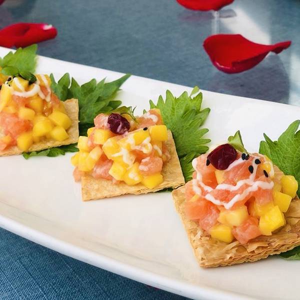 看了各种点评后发现这家店的鹅肝时不时会踩雷,所以只点了一份,不过味道和口感都还是很不错的,吐司烤的火候也很完美,而且两个人一人一片感觉刚刚好,不然吃多了真的会很腻。芒果粒三文鱼挞