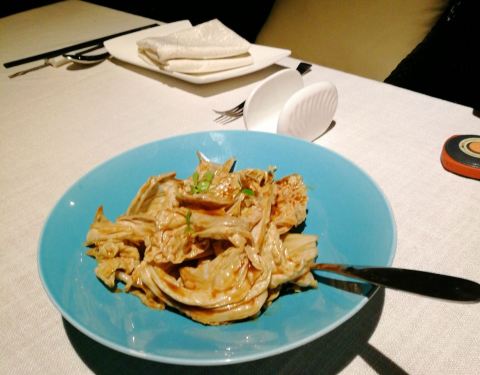 对于传统烤鸭进行了大胆的创新,在保留甜面酱、瓜条、荷叶饼的基础上,增加了芥末牛油果酱、空心饼和酱菜,另外把大葱换成了洋葱。如果硬要拿这道菜去和传统烤鸭比较的话,显然是不及格的,由于油脂不够导致香味明显不足,而且烤制的火候也差了一些。不过如果作为一道创新菜的话,真心还是很不错的,能够让更多人接受烤鸭这种美食,比起传统的烤鸭来也会吃的更健康,而且分量刚刚好,不会造成太大的负担。个人比较喜欢对荷叶饼的改良,极大降低了取饼时的不便,而且还增加了饼的韧劲。鹅肝