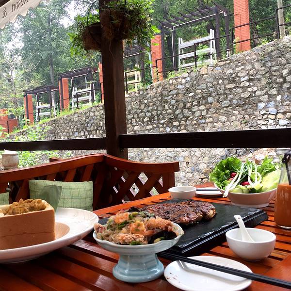 终于来到了传说中的怀柔虹鳟鱼一条沟 朋友极力推荐泰莲庭老鳟鱼餐吧 泰莲庭也是京郊小有名气的度假村 山里的空气清新,环境很美 烤鱼和泰餐的味道也相当正餐厅位于怀柔雁栖镇 距离北京市区70多km 这边叫不夜谷,名气挺大的 几个度假村相距不远 泰莲庭的建筑是砖红色的 从路边经过就可以看到,非常明显 进不夜谷后车速不快一般不会错过看网上的评价这家很火 提前打电话给餐厅订座位 餐厅回复中午11点开餐 早点来不需要订座位,可以直接过来 上午9点多从市区出发 走京承高速,一路高速路非常好走 会经过雁栖湖,那边路修的非常好 周围景色也很漂亮 需要注意的是那段路有限速 过了雁栖湖路段走上双向的车道后 大约再开30分钟左右就到了餐厅的面积挺大的,室内室外2个区域,还有2层露台 装修是典型的泰式风的 据说泰餐做的也非常地道室内在落地窗边有舒适的沙发座 桌子很大,空间宽敞 旁边也有圆桌多人桌在夏天这个季节过来 落地窗外景色也很棒,满眼郁郁葱葱山里的温度比市区低一些 户外区域靠着一条小河沟 周围宽阔,时不时有风吹过,一点也不晒非常喜欢这里的装修 尤其是户外区域座位旁很大面积的水池 仿佛置身泰国小岛上的度假村座位是木制的户外家具,有阳伞 上面有坐垫,座位之间空间很大 环境舒适,惬意靠近小河沟的景观位上有靠垫 6人的位置,旁边有一排2人桌小桌花园里的盆栽也是泰式风格的 对面小棚子下还有一只鹦鹉我们来的比较早还没到开餐时间 2个人坐了6人桌 落座后服务员会主动端上2杯常温的水 是免费的餐厅的菜单有2种,一种是纸质的 另一种是直接用手机扫码,用手机下单点餐 非常方便餐单的种类也很丰富,除了招牌烤鱼 还有泰餐和烧烤到开餐时间我们已经点好菜了,很快就下单了 上菜速度凉菜上的比较快的 热菜的话稍慢,但总体来说可以接受烤鱼端上来后闺蜜吃了几口 跟服务员沟通说希望吃烤的焦一些的 服务员态度很好,又端回去帮我们又烤了一会儿凉菜我们点了蔬菜拼盘 是生的菜蘸酱吃的,酱的味道有点类似甜面酱 菜量很大,最后我们没有吃完 蔬菜非常新鲜,没有蔫的面包咖喱鸡肉看起来量不是很大 吃的时候觉得挺多的 咖喱的味道是泰国的泰式咖喱 既不像日式咖喱偏甜,也不像印度咖喱辣味多 就是刚刚好的浓稠的咖喱 鸡肉的肉质也比较嫩 想起来去年在普吉岛度假的时候 对泰国美食有太多美好的回忆加时间再烤焦一点点的烤鱼 外皮超酥,肉质很嫩 个头也不小,两个人吃有点多 口味不是很重,开始担心会很咸 实际刚刚好,很好吃青木瓜沙拉,每次必点的 分量很足,有鱿鱼,虾,拌的很入味 可能是到这边后换了环境心情好 吃每道菜都觉得幸福满满饮料我们点了奶茶 是冰的,口感很滑 瓶装的,量也不小 菜单上的酒水种类不是很多 度假村前台那边有一个超市 可以去超市里买瓶装饮料带过来喝 点餐时餐厅服务员告诉我们的 服务也是不错的 用餐期间一直有服务员在附近 也有主动帮我们加水 闺蜜提出希望鱼烤的再焦一点 餐厅服务员也很快响应了 服务是比较高效的 服务员身上有对讲机 价位2个人点了300多的 最后烤鱼和青木瓜沙拉没有吃完 打包了 价格肯定是比吃农家院高的 但是整体性价比是非常不错的 光是这边的环境就值了 菜品的出品也都不错 总体来说非常满意的 在泰莲庭度过了一个愉快的周末 餐后我们去了附近的景区 是比较原生态的山山水水 来到这边感觉生活节奏慢了下来 眼前的景色也从高楼林立和拥挤的人群 变成了空旷的山谷,林间小路 闭上眼深呼吸,心情也放松了很多
