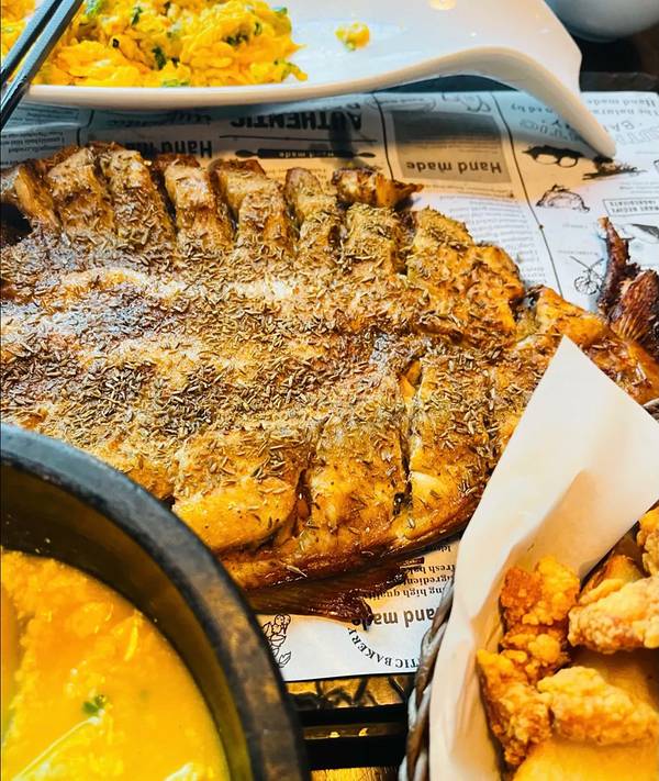 要的金尊,一条辣的一条原味的,别看这里偏西餐化,但是烤鱼的味道和火候依旧掌握的很好,鱼肉很嫩很入味