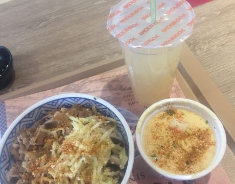 这家吉野家开了很久很久了,其间也装修了几次吧?!来这儿吃饭,有着满满的回忆,以前孩子在附近上小学,常常来此吃饭,如今孩子大学都毕业了,这家餐厅还在!点了一份会员特惠的套餐,餐台旁边还配有自助的调料台供人自选,桃汁饮料很好喝,菌菇牛肉粉,中规中矩吧!