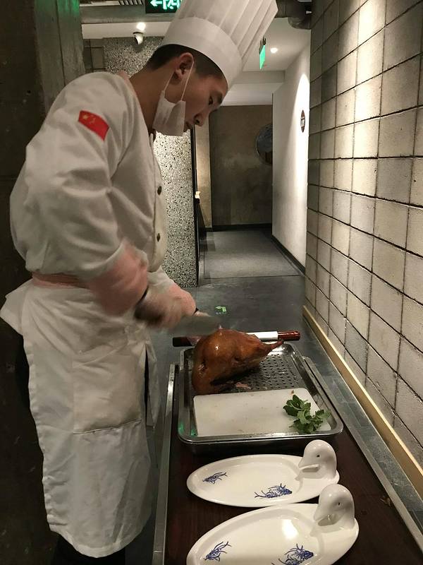 北京烤鸭是京城著名餐食,有说北京游登长城,看故宫和吃烤鸭必不可少。烤鸭数全聚德历史悠久,大品牌。京城百姓吃烤鸭有自己的地儿,不会去全聚德拿号排队花大钱,大鸭梨烤鸭店是最好的选择之一。这家店有年头了,记得本世纪初有一回过年家庭聚餐去过,当时印象最深的是酷似大鸭梨的蒸品,可以假乱真,每桌必点。后来都是为吃烤鸭而去,有会员卡,积分可以换烤鸭,消费一定的金额送烤鸭。现在京城大鸭梨烤鸭店很多,是年节家庭小聚,平日里外吃就餐的好去处。大鸭梨保持了餐食品质和服务水准才赢得食客的信任。大鸭梨烤鸭店连锁经营,初创于1997年,以百姓身边的美食厨房为宗旨,现在有门店六十多家。雅宝路这家规模不小,可以近300人同时用餐,有很多包间。我们午餐去时要排位等座,有好几桌是年末聚餐的。餐厅正在搞岗位大练兵,技艺大展示,服务员衣着整齐,环境整洁,迎新春和年味浓浓。一进门是敞开厨房,烤炉火苗熊熊,厨师挑着白白的鸭子放入烤炉,取出烤好的鸭子。鸭子油亮油亮,香气扑鼻。厨师推着小车到包间或餐桌旁现场切处整齐的鸭片,师傅说,一只鸭子从劈开,去骨,片片要下108刀。这家店一只金牌烤鸭全套158元,价格适中。从菜谱看有老北京菜式和主食,小点。如干炸丸子,小笼米粉肉,葱花饼,宫廷豌豆黄等,也有很多粤式,川味菜式。结账时看到前台桌面趴着一只鸭子工艺品很有趣,我们专门问了前台经理这家的烤鸭和别的品牌有什么不同特色。她说,烤鸭全部是现烤,大鸭梨集团有自己的养殖场,保证鸭子养殖过程规范,统一配送。前往这家大鸭梨在雅宝大厦一层,儿研所附近,公交44, 58, 特2,特12等在雅宝路站下车步行即到。