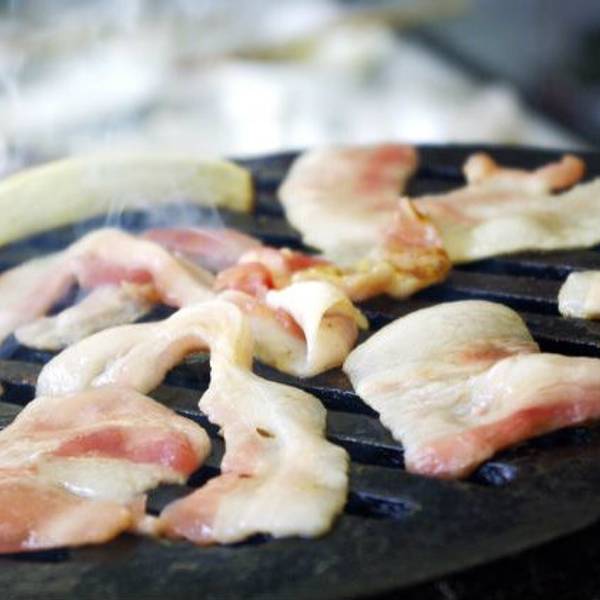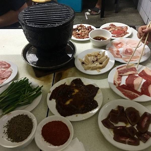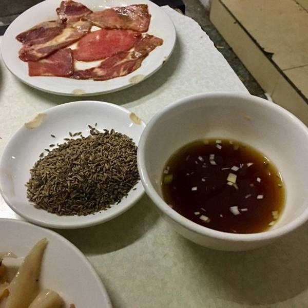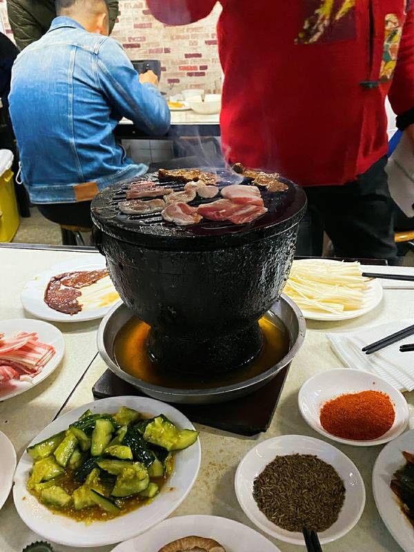 每人一碗它们家的独家蘸料,味道是咸中带甜,又有微微的酸。滚烫的火炉,腌制过的牛肉一放上去就滋滋响,带着浓郁的酱料,在铁板上渐渐收汁,令人垂涎。