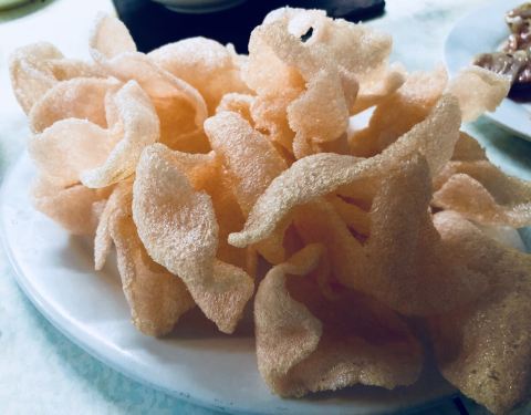 猪五花肉,肥瘦相间,放在篦子上面,肥肉烤出的油滋滋冒响,吃起来绝不会觉得腻。炸虾片、北冰洋,还是小时候的味道。