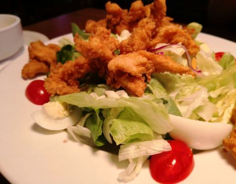 洋葱圈,奥尔良鸡肉沙拉,凯撒沙拉,美式碳烧肋排味道不错