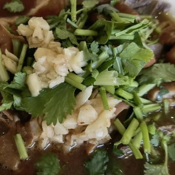 卤煮,蒜汁里加了醋,多放了点蒜所以有点过酸了,可以单独弄一些蒜末就更好了。汤底浓厚,料还可以,味道足!