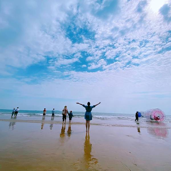 金沙滩,金石滩,名字好像,一个青岛一个大连,傻傻分不清楚,哈哈。 十一的海边,即便是中午时分,海水也不暖和,所以我也没打算入海玩水,只是在海边踏浪挖沙晒晒太阳。 砂质不算细,到处都是拉客的商贩,比如蹦极、水上摩托什么的,不胜其扰,想安安静静的待会儿太难了。