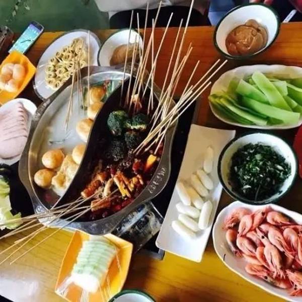 我爱你有很多种表达,比如“一起弥补错过的学生时代”。约上喜欢的人一起Swag!图片来自网络这个场景像极了终极三班,上课吃火锅!想想都刺激~串串是自取的,最喜欢的是凉面和鸡汁土豆泥。凉面的汁调的好~味道甜...