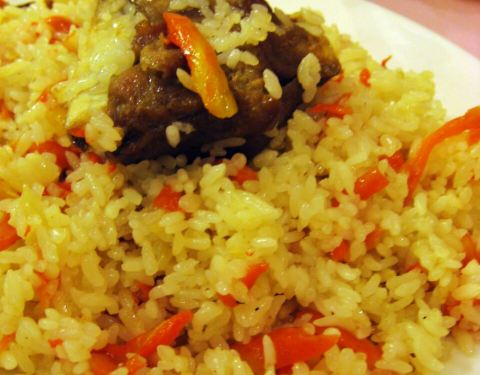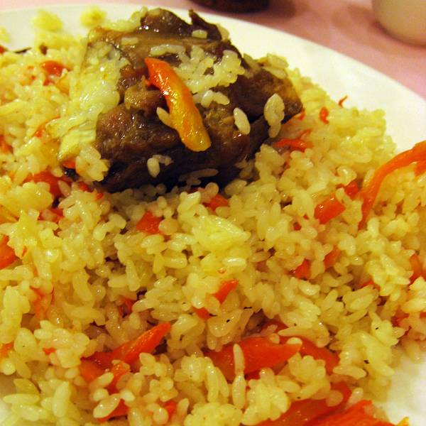 手抓饭,酸奶,写在一起是因为要一起吃,旁边那桌没点别的菜就只点酸奶跟手抓饭,可见是招牌。手抓饭只有一大块羊肉,米饭里面有羊肉的味道,洋葱,胡萝卜,超级香。酸奶油果味,上面的芝麻也炒香了,解腻好喝,酸度比较大,这两个配到一起简直无敌了。