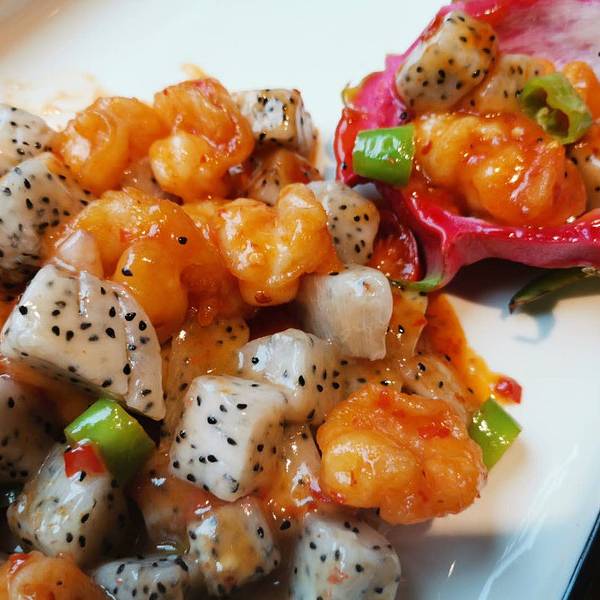 沿着古城墙,迎着初夏不很热的风,把我们送到古城门口,一系列登记,购买通票之后,不足十分钟,就达到了提前预定的客栈。简单整顿乐一下行李,就开始了附近大街小巷的觅食。由于提前做了攻略,各个环节都能做到自然衔接。游人没有想象中的那种熙熙攘攘,但是不拥挤就是我想要的状态,这种清幽的街道,最能让人静下心来慢慢体验这座真是的古城,而不是匆匆赶路完成任务一样去打卡景点。到了一个新奇的地方之后,总是最想先吃一顿来安慰路途的疲惫。在提前了解好路线的前提下,跟着导航很快就到了种草的餐厅,人在北方菜馆,果然是线上攻略里说的那样颜值在线高逼格。门口迎宾的竟然是一位素衣的男店员,很少有迎宾不是美女的,那饭店应该是实力派无疑啦。店外烈日,店里清凉,很舒服的温度。服务很热情,帮忙点菜,全程没有营销点,让人感动。推荐了新菜给我们,适合孩子吃的火龙果配虾仁。孩子很爱吃,量也大。