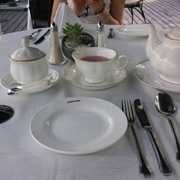 电话: 010-65955135餐厅标示很清晰,就在一个加油站旁边。下图是我的餐券,双人下午茶餐券。福楼法餐厅,下午茶的餐具都很精致,类似于英式下午茶的感觉。我们就坐在室外,阳光很好。周围是低矮的绿树,间或有一些鲜艳的花朵,风景很赞。我点的红茶。当然,下午茶不只是简单的喝茶,还需要有糕点搭配呀~我们的下午茶餐点来啦。无一例外,法式下午茶都是三层架,进餐的顺序从下吃到上,从咸到甜,口味顺序不会改变。摆放的顺序也是如此。餐点包括精致的三明治、新鲜出炉的英式松饼配上奶油和果酱,还有蛋糕和其他甜点。