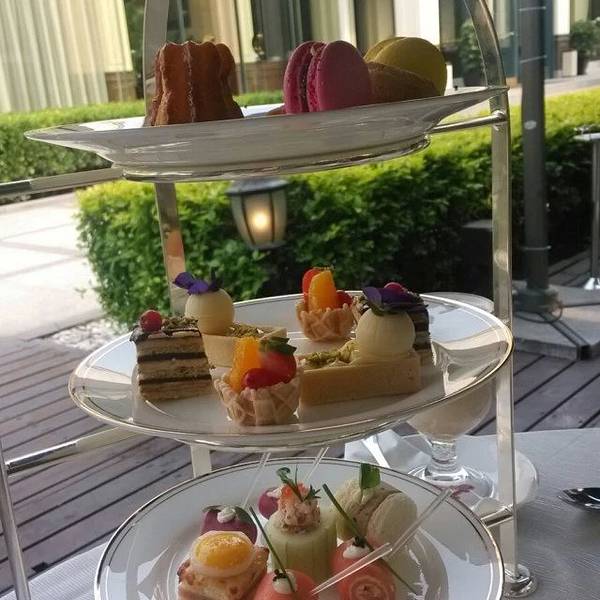 - 餐点包括精致的三明治、新鲜出炉的英式松饼配上奶油和果酱,还有蛋糕和其他甜点。我们就坐在室外,阳光很好实用