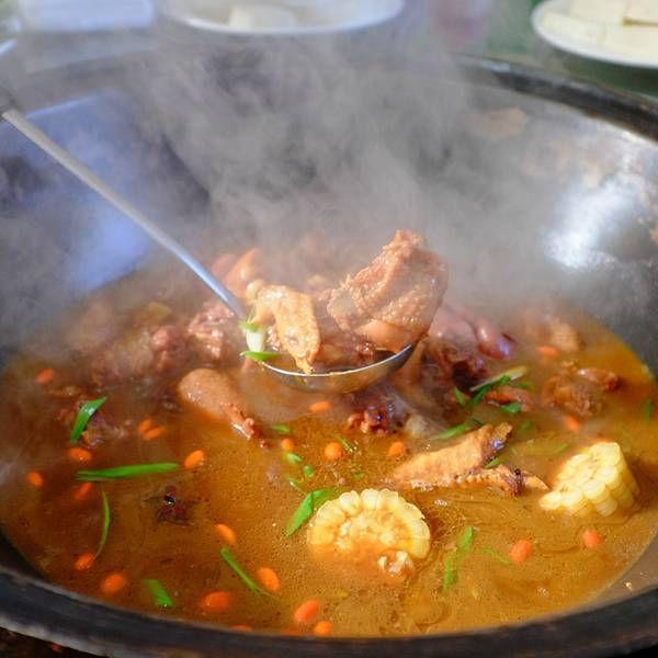 总评:特色铁锅柴鸡,来昌平采摘时值得一试的美食。 周末到昌平区采摘园进行采摘。采摘完到了中午,在附近找吃的,看到这家。离采摘园不算太远,开车几分钟就能到,不过路开车需要掉头。店不临街,要从临街的路口往里开一段。路口正队着军都山滑雪场的滑雪道。来店吃饭的多为自驾,有较大的停车场,车位充足。店内有比较大的一个大厅及十多个包间。店里有两大特色,柴鸡和活鱼。柴鸡是散养的柴鸡现杀现炖和活鱼是从店里的池子里现捞现称现做。我们这次没点与,点了一份柴鸡和几个菜。 儿媳妇,家里来且了,给整理俩硬菜啊,儿媳妇颠颠的跑到院子里去抓下蛋公鸡,公鸡中的战斗机欧耶哈哈。小时候天天跟小鸡一起玩耍,所以听说要去现抓,颠颠的也跑出去看了。院里的鸡都为公鸡,虽说是散养,但大冬天基本上也以吃饲料为主。鸡冠子不太大,体格都不算小,比较有肉。每次抓起都会引来一阵鸡飞狗不跳,废话,哪只鸡不想多活两天,被逮着了就被下锅炖了。杀鸡的过程我就不想描述了,也不想在看了,因为一想脖子那里就会痒…… 鸡上菜会比较慢,除了现杀,还有退毛清晰加工之类的。要等大概一个小时吧至少。建议先吃其他的点菜。店里的豆浆很好喝。油炸的饼也很不错。剩下的咱们看图说话吧。