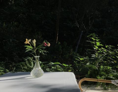 是晨光调皮的刺破山林中层层的树叶,然后我又看到叶子羞愧的掉了下来。感谢今晨醒来时的看到的这幅画面,才让我愿意离开舒适的大床,想向林中深入几步,去探究这六和塔钟声覆盖的九溪十畔。 左闻溪潺,右听蝉鸣,步道而上。 偶遇引山泉水的爱茶客,应是一大早便上山来接晨露冲茶,想必这样冲泡出来的狮山龙井该尤为甘甜。更有清晨开嗓的评弹票友,将吴容软语唱的是婉转悠扬,而曲声正是把我不断引入山林深处。 实在是担心山中信号全无,只有作罢回程,与朋友汇合在酒店餐厅,这才有空来细细打量起来。两层高的小木屋撑出几个好看的遮阳帐篷,干净的白色藤编椅无聊的散座在对面的小径,茶桌上的插花却是精神的一朵朵直立着抢着太阳,那花露让人以为是晒出了汗水一般。 屋内四方的吧台放满了各种烹饪器具,过道的墙面是整架的红酒,屋后是别有洞天的小院。大槐树下一张由整块木材铺开的太台面特别讨人喜欢,你都能直接联想到昨晚在这里是哪位少女的成年礼,她们怎么庆贺,怎么嬉闹,怎么釀跄,当然此时落花又铺上了一层台布,好像又在等待新的庆祝。 随便选个位置坐下,蔬汁,面包篮,松露煎蛋,黄鱼面,和一些矫情的小菜碟依次上来,然后清空台面,留一只花,一壶茶,和半桌阳光,陪我一直呆到被俗事叫醒。