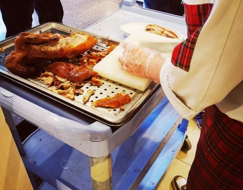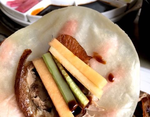 - 烤鸭是现切的,师傅的刀功不赖,包裹在饼皮里的配菜也很丰富,烤鸭酱做的非常好吃。真的没有让我失望