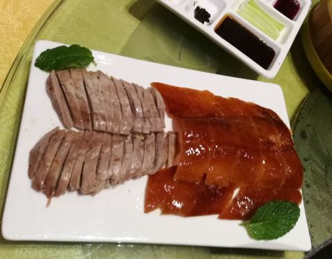 来这里吃烤鸭。点了一套烤鸭,一共两盘肉,外加一盘鸭头、鸭翅、鸭里脊。鸭架带走。还送了鸭松和鸭汤。烤鸭味道不错,服务也好。门口可以免费停车,但我们去的时候到了饭点,人很多,门口没车位,我们停车到后面小区,到了大堂还要等位。