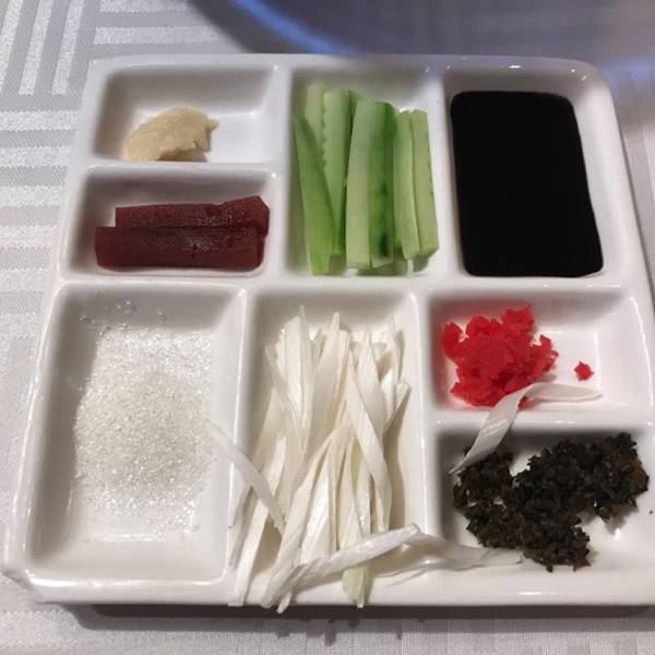 然后才是鸭肉卷小饼的传统吃法,最后试验抹蒜泥酱后放烤烤鸭蘸酱,再加酸菜和腌黄瓜酱碎,这么重口的吃法其实味道也还不错,我个人还是更喜欢传统的。