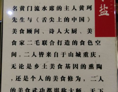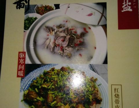 菜品卖相不好,食物的分量也比较少,点的毛血旺看起来就是乱炖,黑乎乎一盆,毛肚太脆了,还有午餐肉品质很差,胶质很多的感觉不好嚼还78一份好贵;王献排骨是招牌,轮根22元一个卖,挂文房特制笔架上,看起来很有意境,不过是那种半筋排骨肉很少,味道很咸类似风干肉;鸡丝凉面和赖汤圆还可以,这俩比较地道,性价比挺低。 - 天下盐出品正宗地道的精致川菜。特色菜肴:天下盐的菜色集江湖经典,野道风骚于一身,大俗大雅,皆混合其中