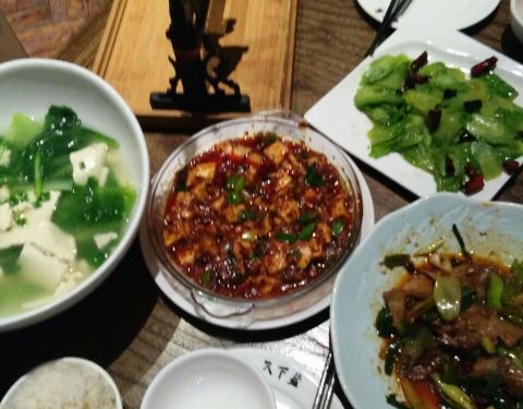 水煮牛肉有点咸,麻婆豆腐还行,银鱼炒蛋凑合