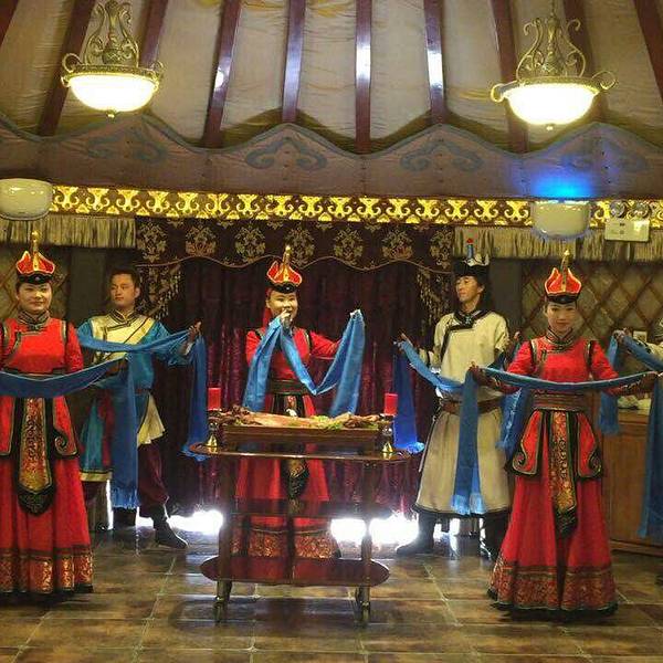 饭菜口味:我们包了一个蒙古包,里面两大桌,一桌大概12个人,每桌半只烤全羊,上烤全羊的时候还有蒙古族俊男靓女的歌舞,拉着我们一起跳来跳去,整个气氛都被带动了,烤全羊超级好吃,服务员帮忙用饼夹起来给我们吃,很体贴!我们那天因为是小孩子满月,所以还举办了隆重的仪式,蒙古族的靓女们还过来献哈达,一起载歌载舞的,好不热闹,这里的奶茶也很好吃,奶茶就是和饮料一样,到这里就是来吃烤全羊,羊排,羊腿,奶豆腐什么的也都不错,别的东西比如野生菌牛肉什么的并非特色的,我觉得可以不在这里吃。羊肉串价格便宜,3元每个,但是因为我们要了烤全羊就没有点!