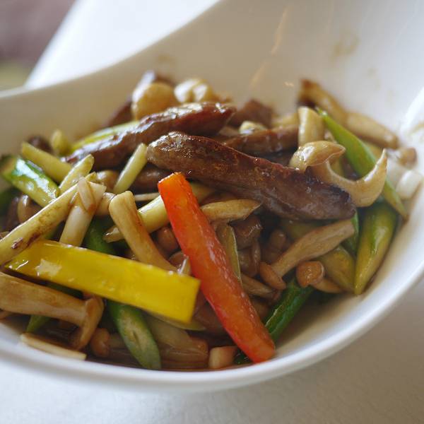 这道菜看起来普通,其实如果百合的颜色和口感刚刚好的话是不容易炒的,加入松子使得整道菜显得口感更丰满了。杏鲍菇