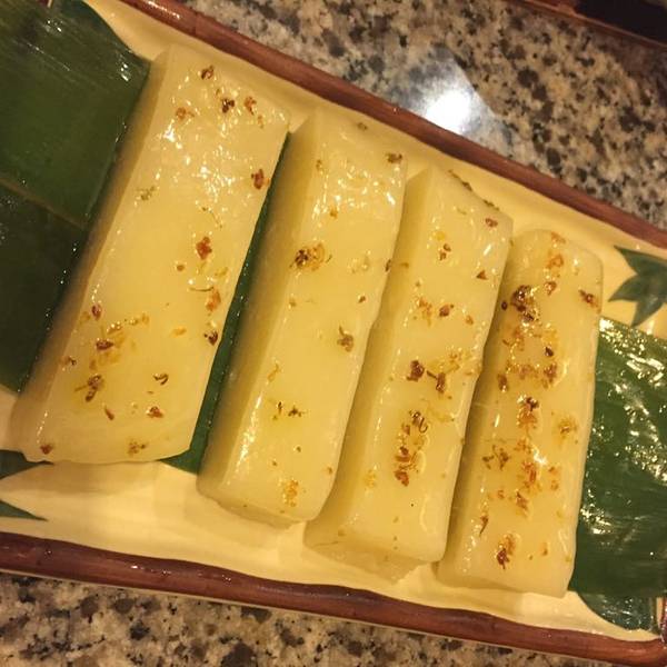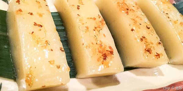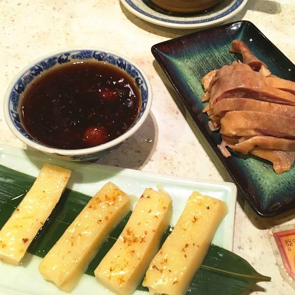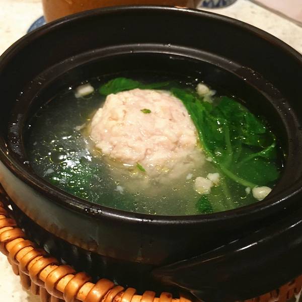 我们点了一份汤、桂花拉糕、古法糖芋苗、狮子头和盐水鸭,都是招牌。