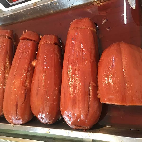 每片藕都熬煮的粉烂,糯米香软适度。现挑现称现切,只为保证食物本身的美味,切片时两片藕连在一起不愿意分开。浇一点冰糖和蜂蜜的卤汁,藕的软烂,糯米的香糯,蜂蜜的香甜都融合在了一起。