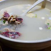 鸭得堡成立于2006年,是与回味齐名的鸭血粉丝店,有多家分店,这家位于居民区间的小巷中,餐厅布置是快餐式的,原木色调的桌椅,看上去比较清爽,在收银台买单后,需要自己去窗口取鸭血粉丝汤。 酒香不怕巷子深,不少游客是专程前来的,一般点全套鸭血粉丝汤,价钱比别处贵了几元但分量十足,一大海碗包括鸭肫、鸭肠、鸭肝、鸭血、鸭心等,粉丝细腻,汤底是老鸭熬制成的,奶白色,味道鲜美,最好再买点锅巴掰碎了泡在汤里,等锅巴充分吸收汤汁后,吃上去又香又鲜。如果没有吃饱,可以再买鸭油烧饼吃。