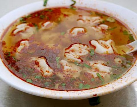 价目表上有三种,大碗,小碗,特大碗。馄饨端出来,感觉比普通的馄饨大些,皮比较薄,但是有韧性,没有破的,肉的味道还算鲜美,辣椒很好吃,一碗下去大汗淋漓,价钱实惠,分量足。