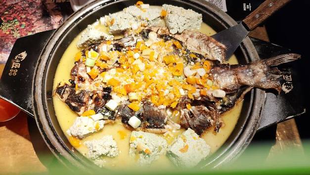 地方挺大的。表妹不能吃辣,就点了酸辣烤鱼,以前跟朋友基本都是吃麻辣 两个人食量有限,只点了鱼,没单独加素菜在里面了,每次必点的包浆豆腐,烤的掌中宝还是一如既往的好吃。 服务还不错的。吃饭间隙看到一个用锡纸包着的盘,听说是限量要预定,有点想尝试 总体来说,烤匠的味道还是稳定,每次有朋友来,都会给她们推荐吃。