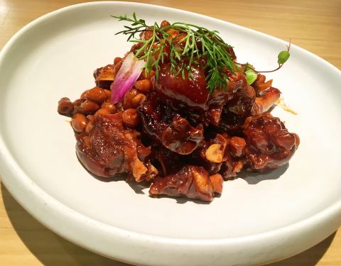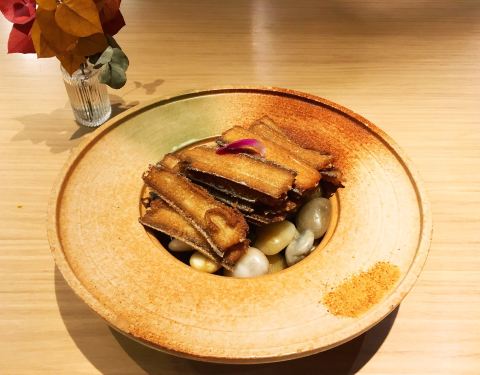 [环境]餐厅内的面积很大,头顶的造型很有创意,整体的装修颇有艺术气息。 [服务]特殊时期卫生工作做得很好,服务员们都带着口罩和手套,也会定期更换一次性手套,餐具都在消毒的基础上,再用热水烫。口罩也没有阻挡服务的热情又细心,温暖着我们。 「奉天老式锅包肉」老式锅包肉分为两种,一种是传统的猪肉,另一种是牛肉,牛肉的比猪肉的贵10元。 「炸刀鱼」视觉上显得刀鱼特别多,实际没有那么多喔,数量适中,也是很好吃。 「黑金猪手」黑金猪手的造型也很好看,猪手上覆盖的是花生酱,咸甜口味,猪手很有嚼劲儿,很好吃。 「软炸里脊」里脊的颜色看起来很有食欲,肉质很有嚼劲儿,很香。