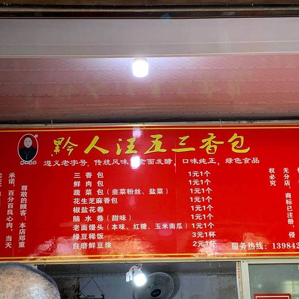 早上在遵义会议会址游玩出来后,发现有很多人在一家店门口排队,赶紧上前查看是什么情况。凑拢发现是一家包子店,目测至少有10人以上排队。购买的客人至少都是10个以上地买,生怕售罄,感觉要把排队的时间挣回来。 赶紧排队,遥望到价目表上有“三香、鲜肉、蔬菜包”,再仔细一看价格,居然是1元1个!在贵阳馒头都是这个价了, 他家居然这么便宜,怪不得排队的人这么多! 等了大概10分钟购买上,咬了一口名字最吸引人的三香包,包子虽然不大,但是馅儿挺多的,甜味和咸味都有,还有香葱在内。有点像平时吃的三鲜包,味道挺独特,强烈推荐购买!