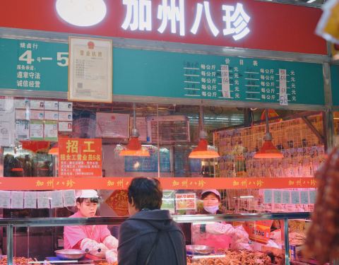加州八珍的老店是在交易市场,后来在悦汇广场开了分店,不管是哪家店,都是排队的,店里主打鸡脚,半只的是酸辣味,浓浓的蒜香,鸡皮爽脆。整只的是麻辣的,也是很好吃的。鸡脚非常入味,恨不得骨头都嚼碎了。除...