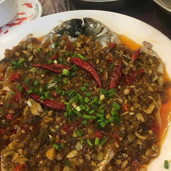 ...鱼,肉质鲜嫩鱼刺少,整条鱼浸在油里,鱼身上下铺满了姜蒜蓉和萝卜干,吃完鱼肉,用配料拌饭非常好吃